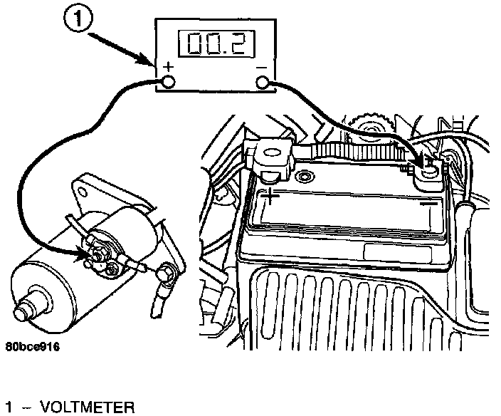 a. Connect the positive voltmeter lead to the battery positive terminal, and negative lead to battery cable terminal on starter solenoid. Rotate and hold the ignition switch in the START position. If voltage reads above 0.2 volt, correct poor contact at battery cable to solenoid connection. If reading is still above 0.2 volt after correcting poor contacts, replace battery positive cable.