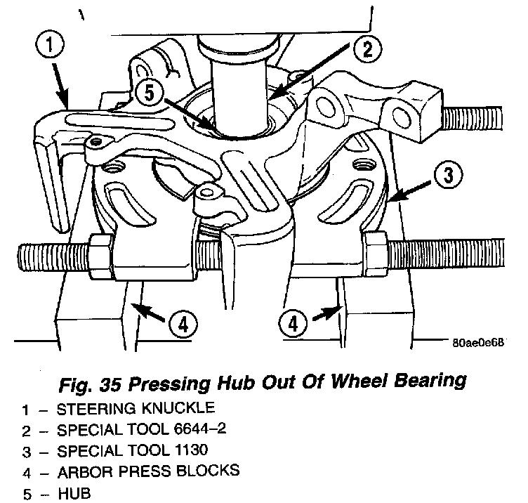 NOTE: The removal and installation of the wheel bearing and hub from the steering knuckle is only to be done with the steering knuckle removed from the vehicle. Removal of the wheel bearing from the steering knuckle must be done using the following procedure.DISASSEMBLY