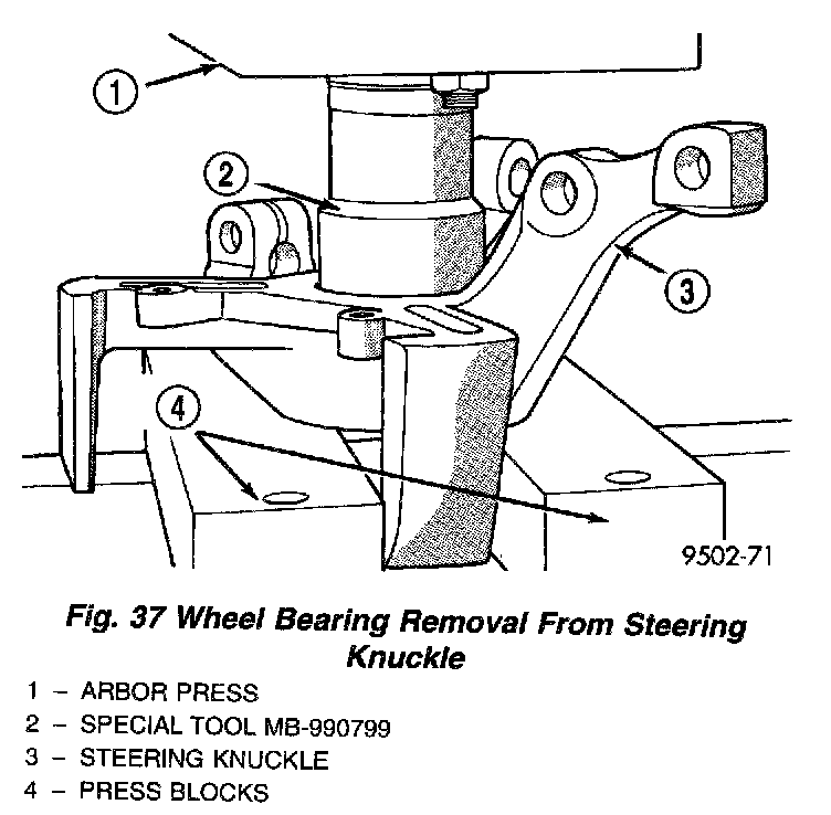 10. Place the steering knuckle back in the arbor press supported by press blocks as shown. The press blocks must not obstruct the bore in the steering knuckle so the wheel bearing can be pressed out of the steering knuckle. Place Bearing Driver, Special Tool MB-990799 on the outer race of wheel bearing. Press the wheel bearing out of the steering knuckle.