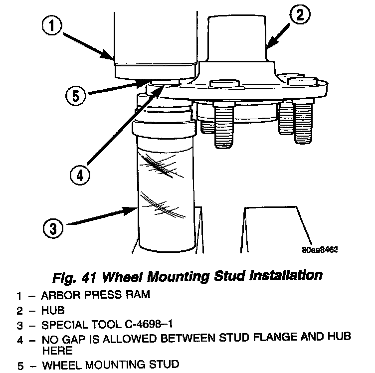 4. Place the previously removed wheel mounting stud back into the hub flange. Place the hub in the arbor press supported by Special Tool C-4698-1. Press wheel mounting stud into hub flange until it is fully seated against the back side on the hub flange. Remove the hub from the press.