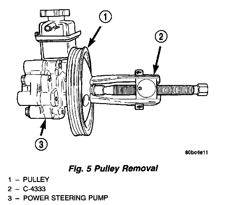 1. Install Puller, Special Tool C-4333, or an equivalent, on the steering pump pulley as shown. Tighten the puller screw drive and remove the pulley from the power steering pump shaft.
