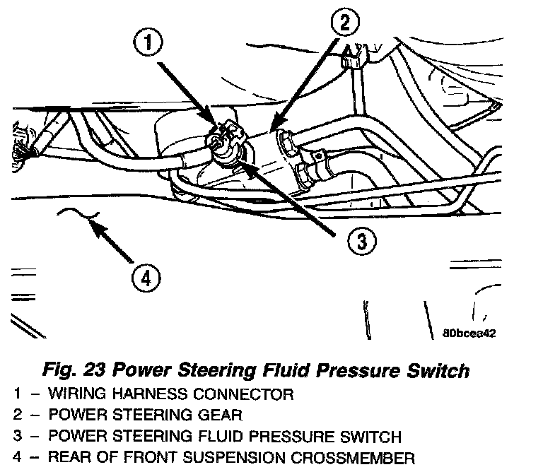 7. Reconnect the wiring harness connector to the power steering fluid pressure switch. Be sure the locking tab on the wiring harness connector is securely latched.
