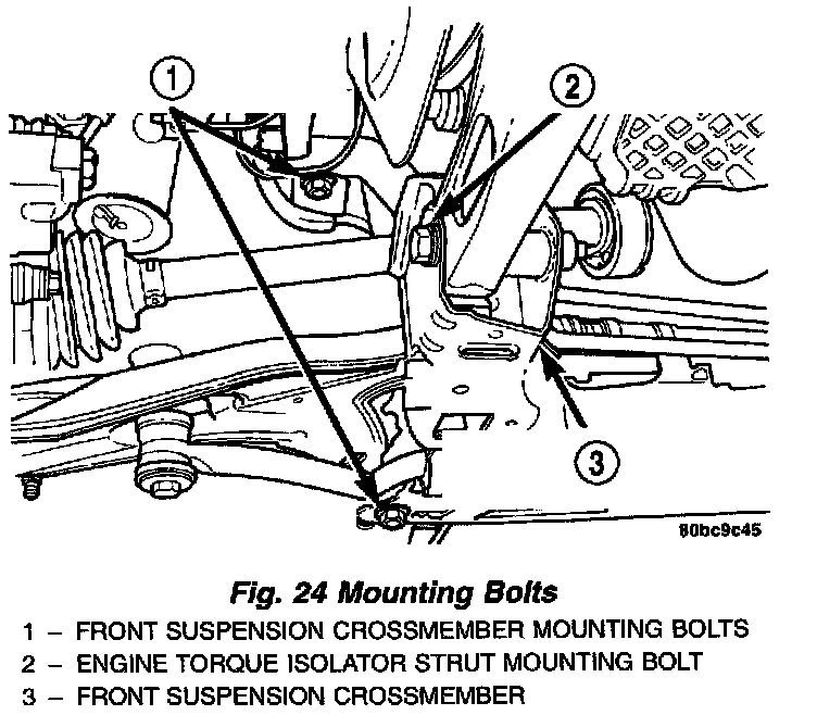 5. Remove the bolt mounting the engine torque strut to the right forward corner of the front suspension crossmember.