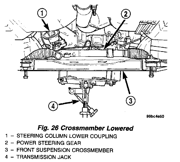 10. Lower the front suspension crossmember using the transmission jack enough to allow sufficient access to the steering column lower coupling. When lowering front suspension crossmember, do not let crossmember hang from lower control arms or power steering hoses. The weight should be supported by the transmission jack.