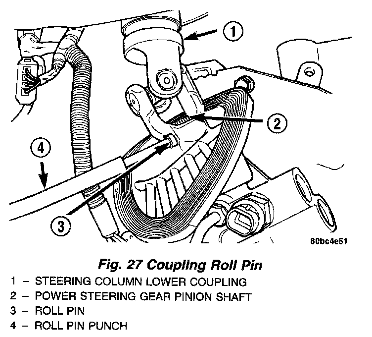 11. Remove the roll pin securing the steering column lower coupling to the power steering gear pinion shaft using a roll pin punch. Push the steering column lower coupling up and off of the power steering gear pinion shaft.