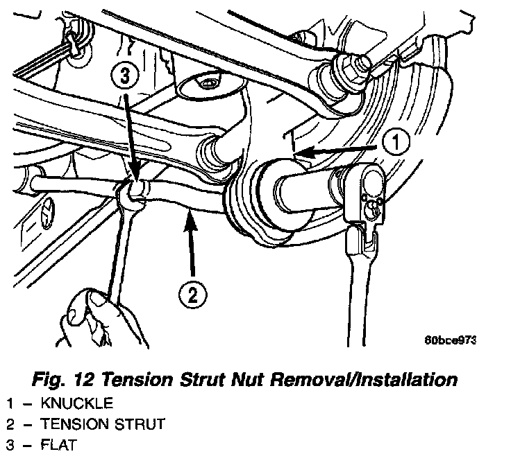 3. Disconnect the tension strut from the knuckle. To do this, first hold the tension strut from turning by using a wrench on the flat on the tension strut and then remove the nut from the rear of the tension strut. Next, remove the tension strut retainer, then the rear tension strut bayonet bushing