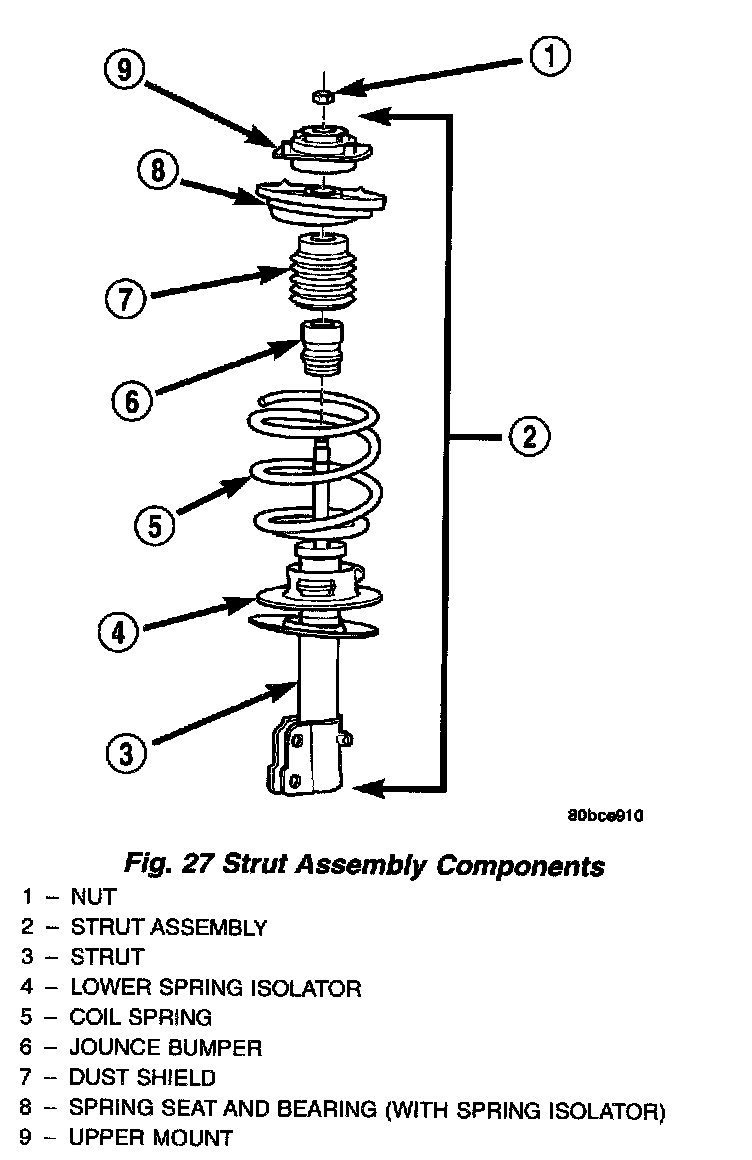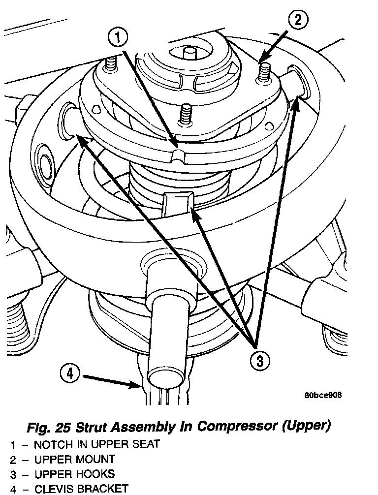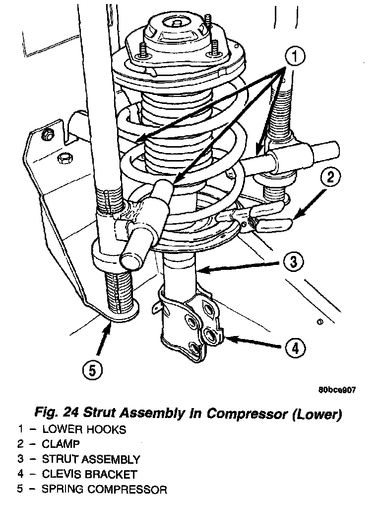 The Strut assembly must be removed from the vehicle for it to be disassembled and assembled.For the disassembly and assembly of the strut assembly' use strut spring compressor, Pentastar Service Equipment (PSE) tool W-7200, or the equivalent, to compress the coil spring. Follow the manufacturer's instructions closely.