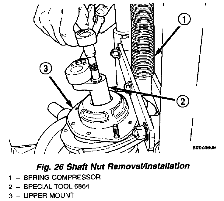 WARNING: DO NOT REMOVE THE STRUT SHAFT NUT BEFORE THE COIL SPRING IS COMPRESSED. THE COIL SPRING IS HELD UNDER PRESSURE AND MUST BE COMPRESSED, REMOVING SPRING TENSION FROM THE UPPER MOUNT AND PIVOT BEARING, BEFORE THE SHAFT NUT IS REMOVED.