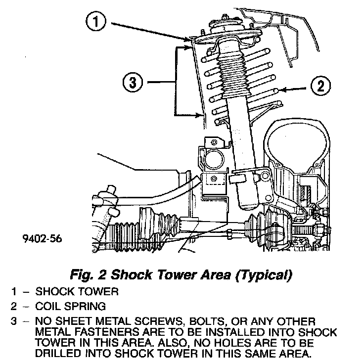 - Inspect the clearance between the shock tower and the coil spring. Make sure no fasteners are protruding through the shock tower possibly contacting the coil spring and strut. Because of the minimum clearance in this area, installation of metal fasteners could damage the coil spring coating and lead to a corrosion failure of the spring.