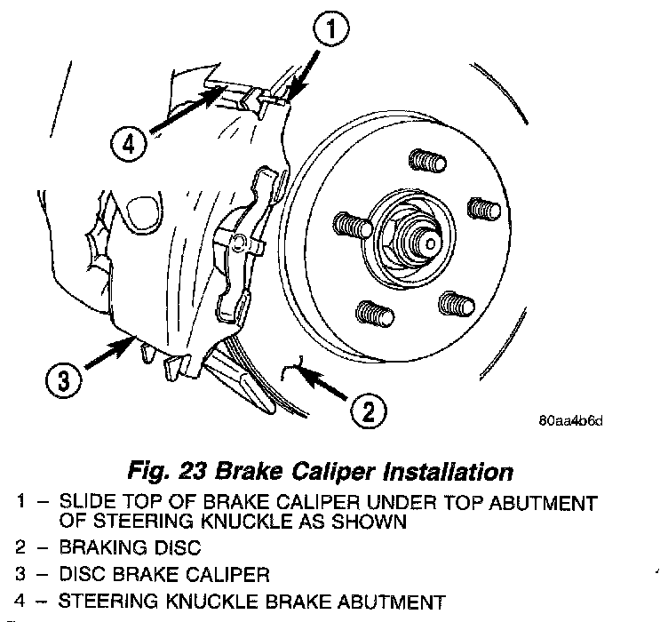 4. Install the disc brake caliper (with pads) on the brake rotor and steering knuckle. The left side caliper is installed by first sliding the top of the caliper past the top abutment on the steering knuckle to hook the top edge of the caliper, then pushing the lower end of the caliper into place against the knuckle. The right side caliper is installed by first sliding the bottom edge of the caliper past the lower abutment on the steering knuckle to hook the lower edge of the caliper, then pushing the top of the caliper into place against the steering knuckle.