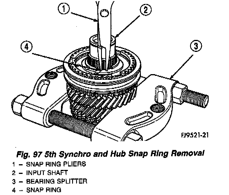 1. Install bearing splitter behind 5th speed gear. Remove snap ring at 5th synchronizer hub on input shaft (Fig. 97).
