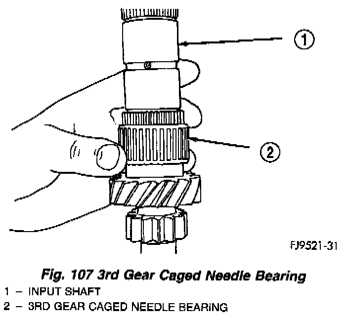 11. Remove 3rd gear caged needle bearing (Fig. 107). Check the caged needle bearing for a broken retention spring.