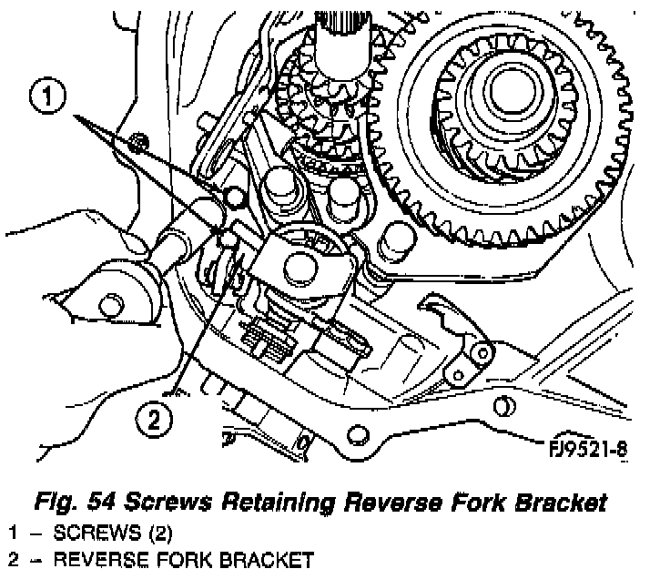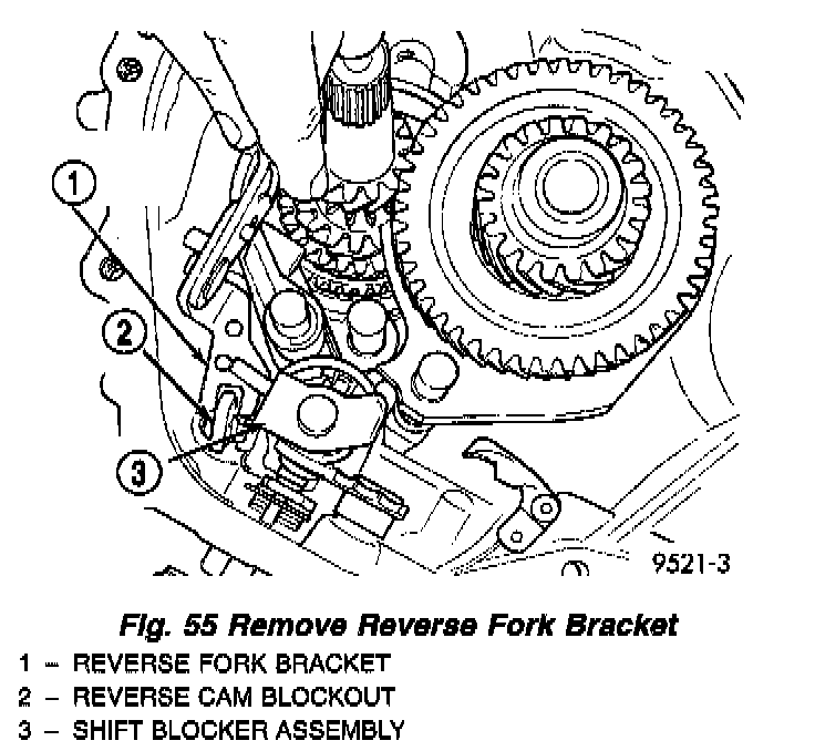 12. Remove two screws retaining reverse fork bracket (Fig. 54). Remove reverse fork bracket and reverse cam blockout assembly (Fig. 55).
