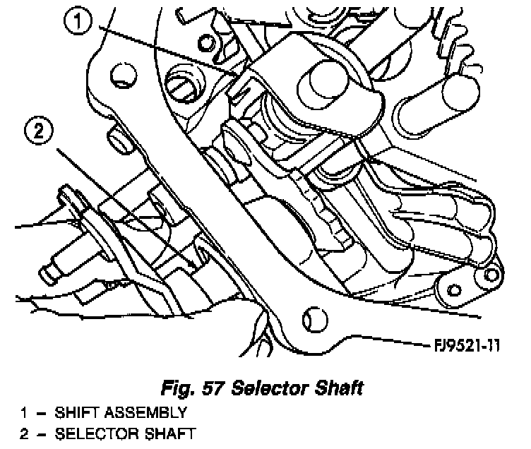14. Pull the selector shaft shift pin out of the slot in the blocker assembly. Turn selector shaft up and out of the way (Fig. 57).