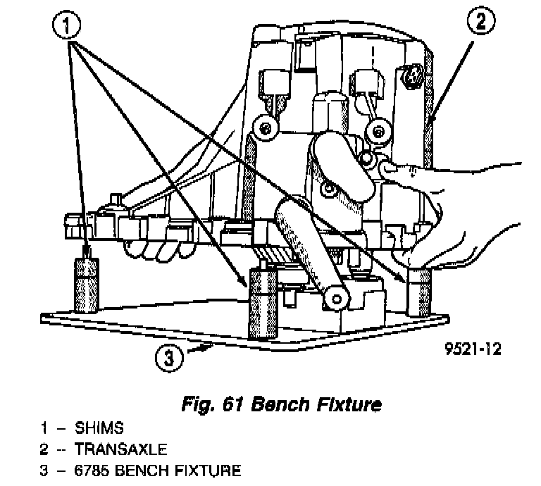 17. Using bench fixture and shims provided (Miller tools # 6785, 6785-1, and 6785-2), turn transaxle over. Install transaxle onto bench fixture (Fig. 61). Verify shim spacers are in position on bench fixture. Install transaxle into shop press.