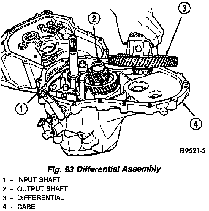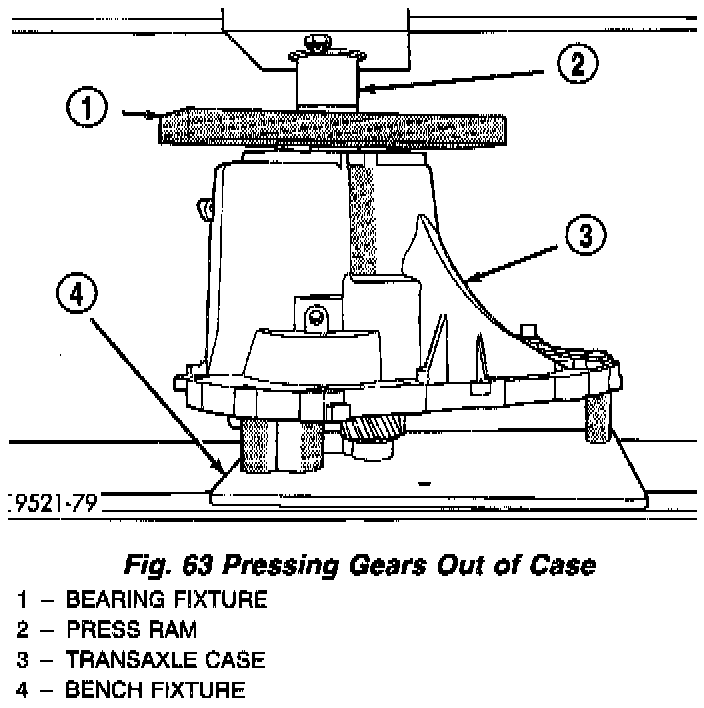 19. Install transaxle gear case into shop press. Press output and input shaft assemblies out of case (Fig. 63).