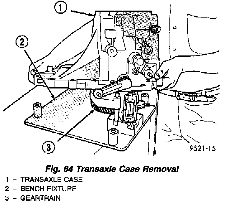 21. Carefully remove transaxle case from the shaft assemblies and bench fixture (Fig. 64). Be sure the oil-feed trough to the end bearings is not damaged (Fig. 65).
