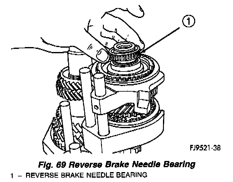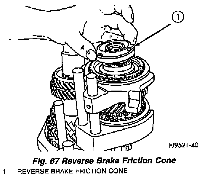 22. TRANSAXLE W/REVERSE BRAKE: Remove the reverse brake blocking ring, shim, reverse brake friction cone, bearing and race from the input shaft assembly (Fig. 66) (Fig. 67) (Fig. 68) (Fig. 69) (Fig. 70). TRANSAXLE W/O REVERSE BRAKE: Remove plastic spacer from the input shaft assembly.