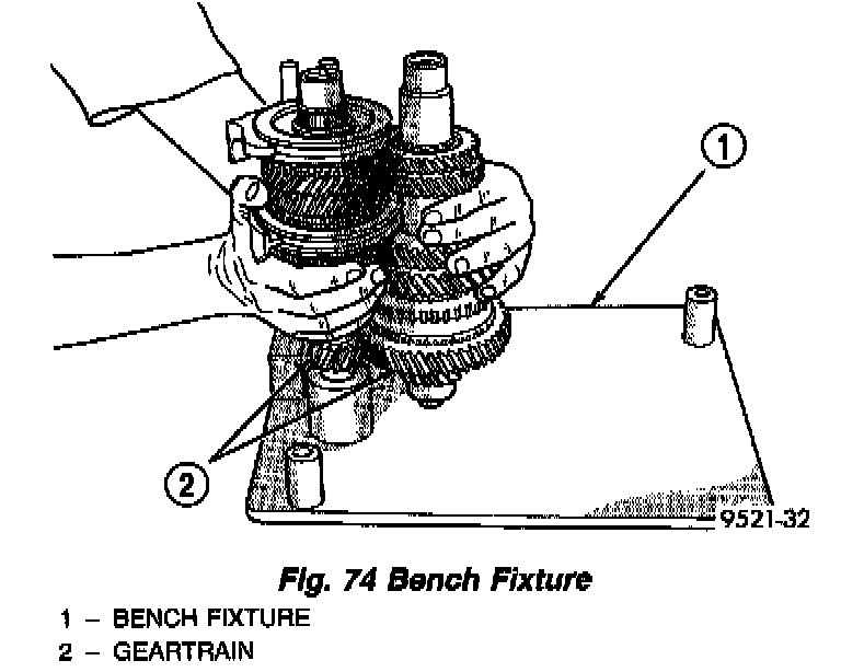 1. Verify bench fixture shims are removed from bench fixture. Install output and input shafts into bench fixture (Miller tool #6785) (Fig. 74).
