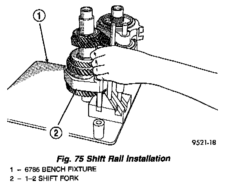 2. Install shift rails and forks into bench fixture (Fig. 75).