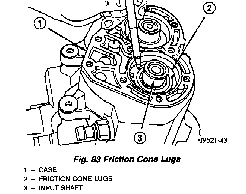 10. Line up reverse brake friction cone lugs to the slots in the gear case (Fig. 83). Verify reverse brake shim is in position.