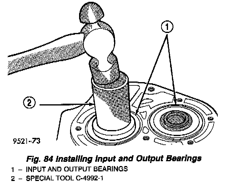 11. Position input and output bearings on the shafts. Using Miller tool C-4992-1, press on input and output shaft bearings until they bottom into the case and against the shafts (Fig. 84).