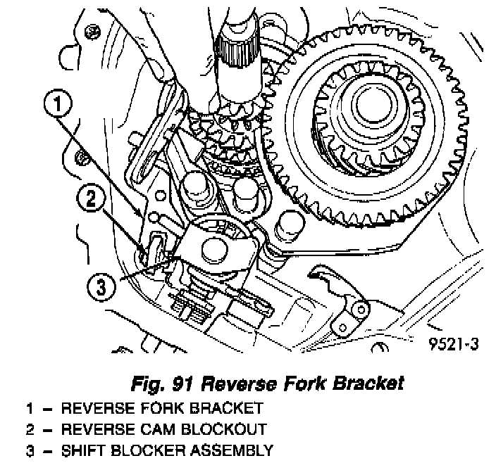 21. Install reverse fork bracket and reverse lockout. Tighten screws to 11 Nm (96 inch lbs.) torque (Fig. 91) (Fig. 92).