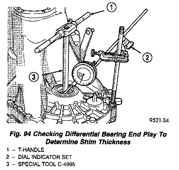 10. Using Special Tool C-4995 and an inch-pound torque wrench, check turning torque of the differential assembly (Fig. 95). The turning torque should be 6 to 12 inch lbs.. If the turning torque is too high, install a 0.05 mm (0.002 inch) thinner shim. If the turning torque is too low, install a 0.05 mm (0.002 inch) thicker shim.