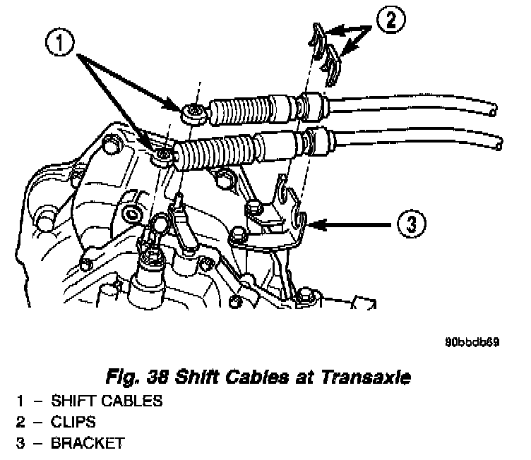 9. Remove shift cable-to-bracket clips (Fig. 38).