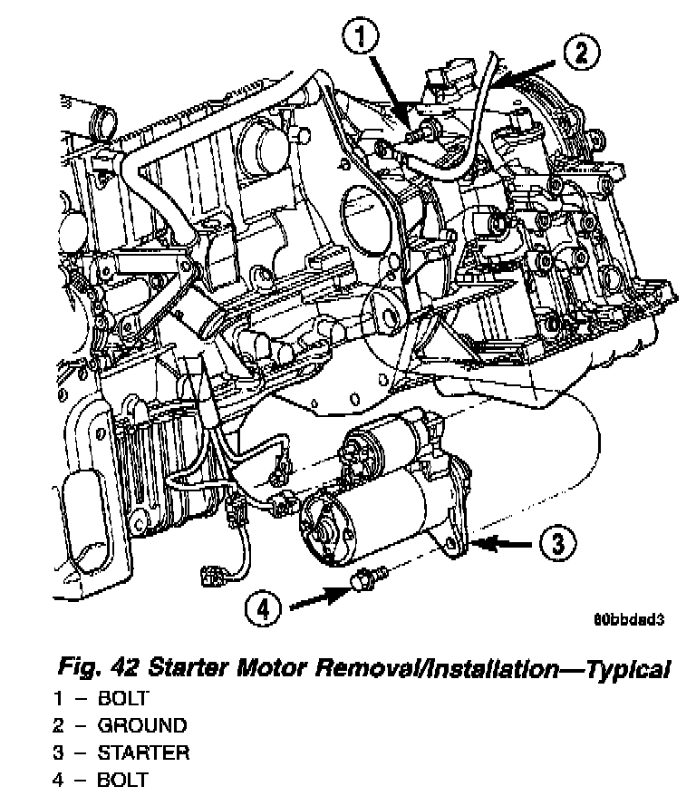 6. Install starter motor and tighten bolts to 54 Nm (40 ft. lbs.) torque. Make sure to fasten ground cable to upper starter bolt as shown in (Fig. 42).