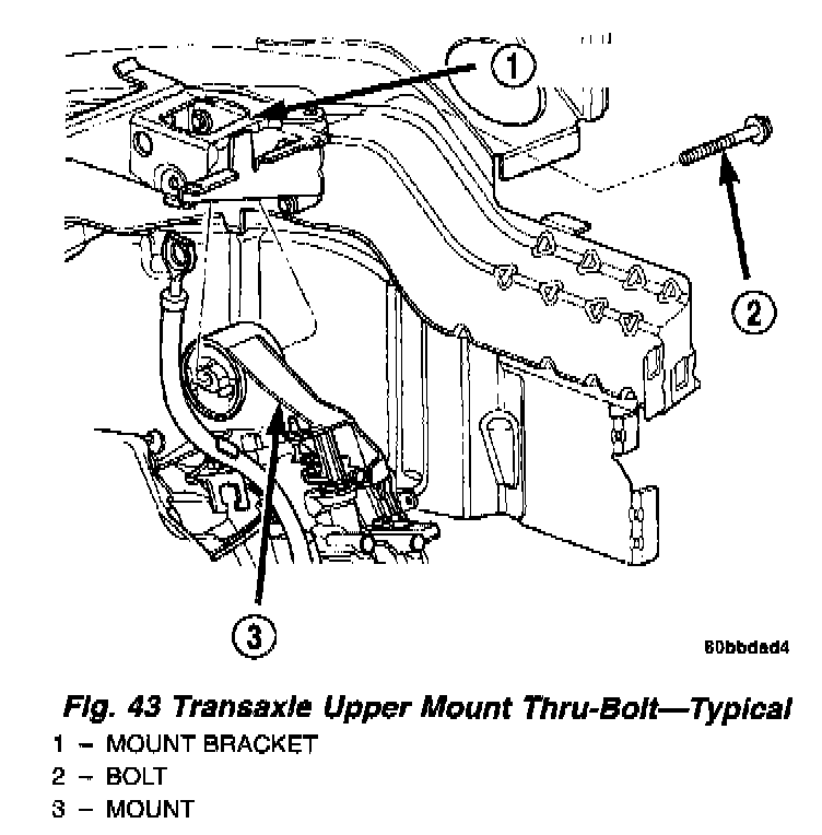 22. Remove transaxle upper mount thru-bolt. Gain access to this bolt through the driver's side wheel house (Fig. 43).