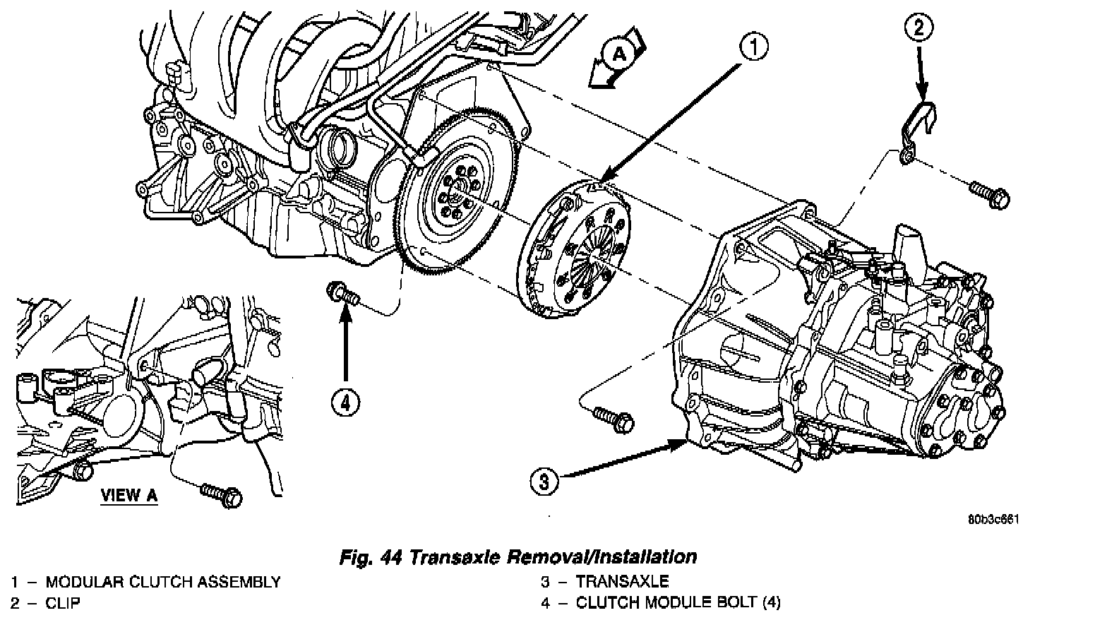 24. Obtain a helper to assist in holding transaxle while removing transaxle-to-engine mounting bolts (Fig. 44).