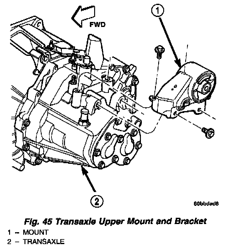 26. If installing a new or replacement transaxle, remove the upper mount as shown in (Fig. 45), transfer to the replacement unit and torque all bolts to 68 Nm (50 ft. lbs.) torque.