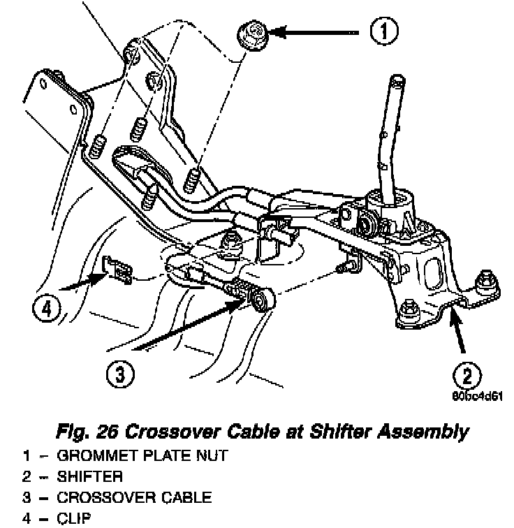 3. Install crossover cable to shifter lever and secure cable to shifter bracket. Install clip (Fig. 26).