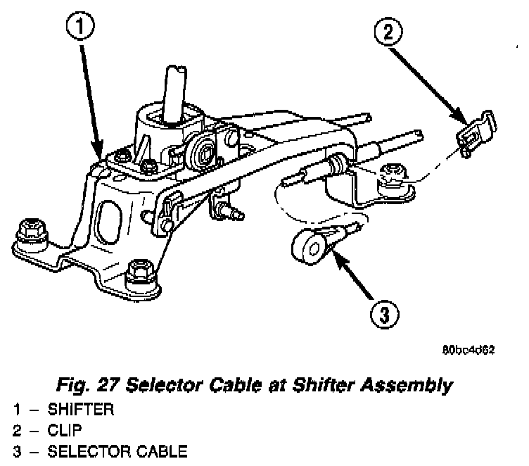 2. Install selector cable to shifter lever and secure cable to shifter bracket. Install clip (Fig. 27).