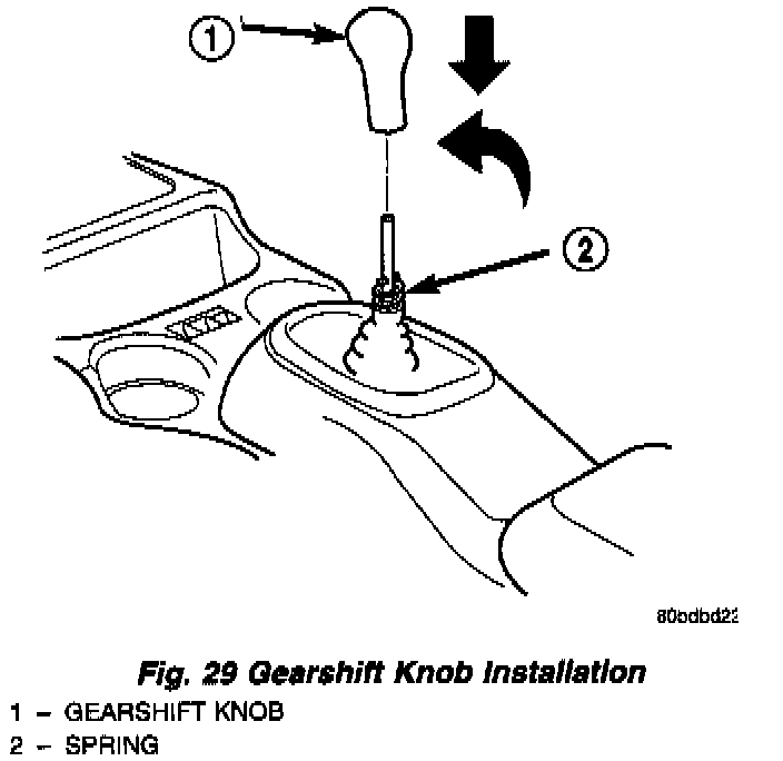 6. Install knob to shifter lever, align knob to three o'clock position, push knob down to engage spring and rotate counter clockwise (Fig. 29).
