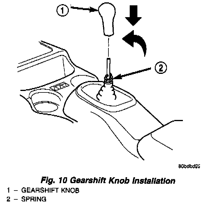 3. Install knob to shifter lever, align knob to three o'clock position, push knob down to engage spring and rotate counter clockwise (Fig. 10).