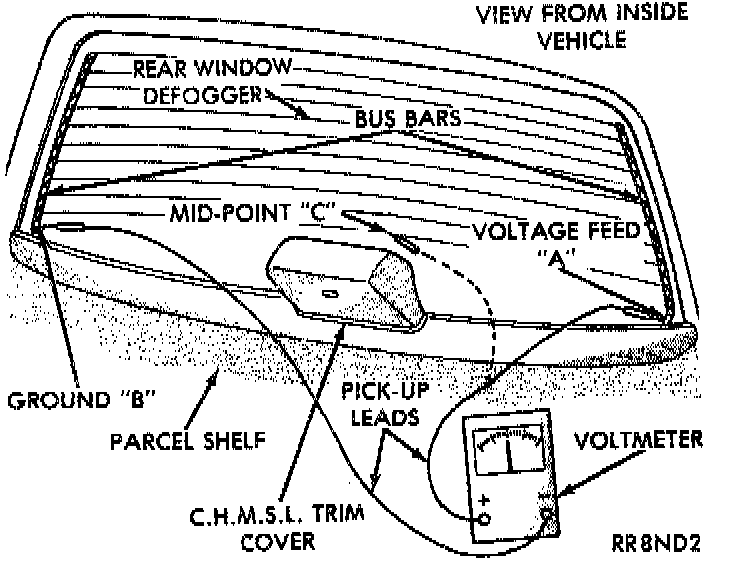 3. The rear window defogger operation can be checked by feeling the glass. A distinct difference in temperature between the grid lines and adjacent clear glass can be detected in three to four minutes of operation.