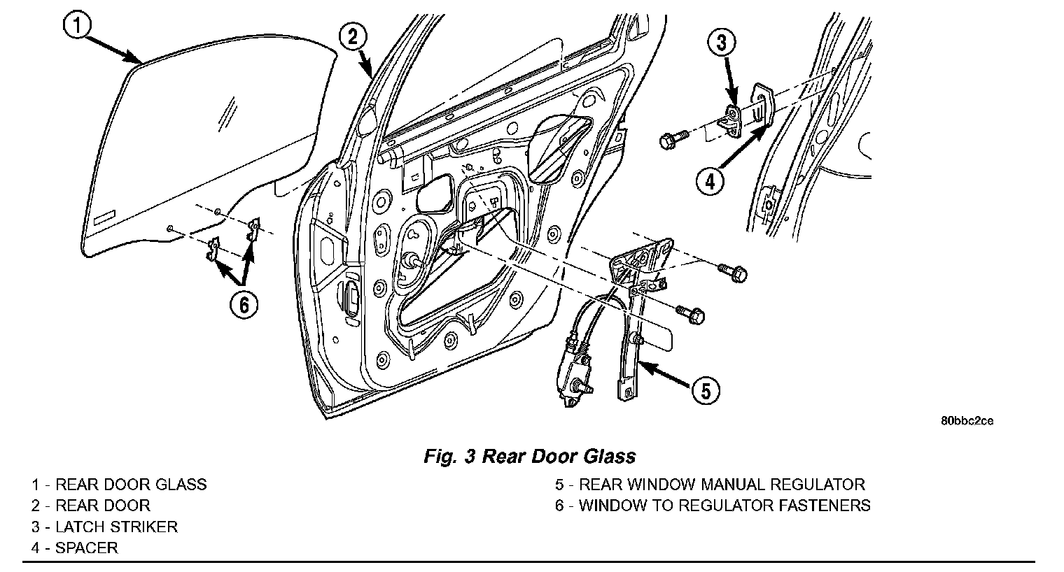 3. Loosen bolts attaching rear lower run channel to inner door panel (Fig. 3).