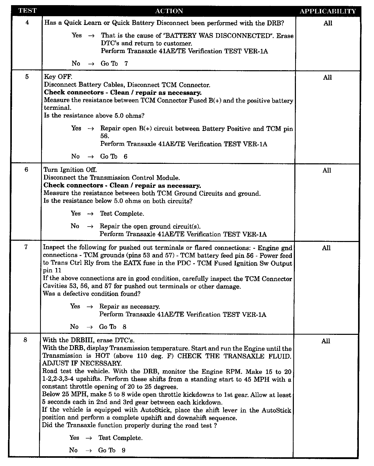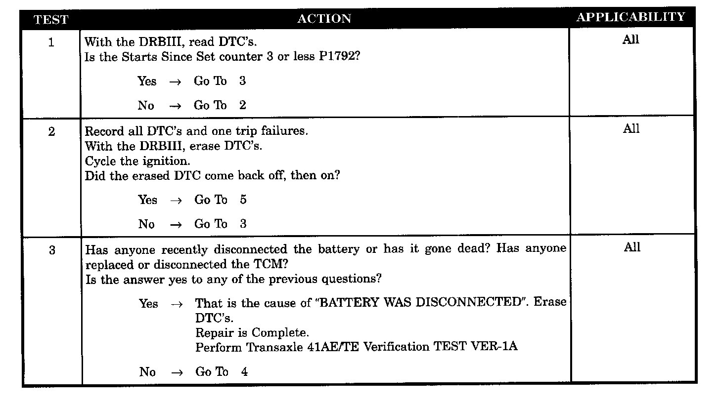 Set Condition: The code sets whenever the TCM is disconnected from B(+) or ground. It will also be set during the DRB "Quick Battery Disconnect" procedure.