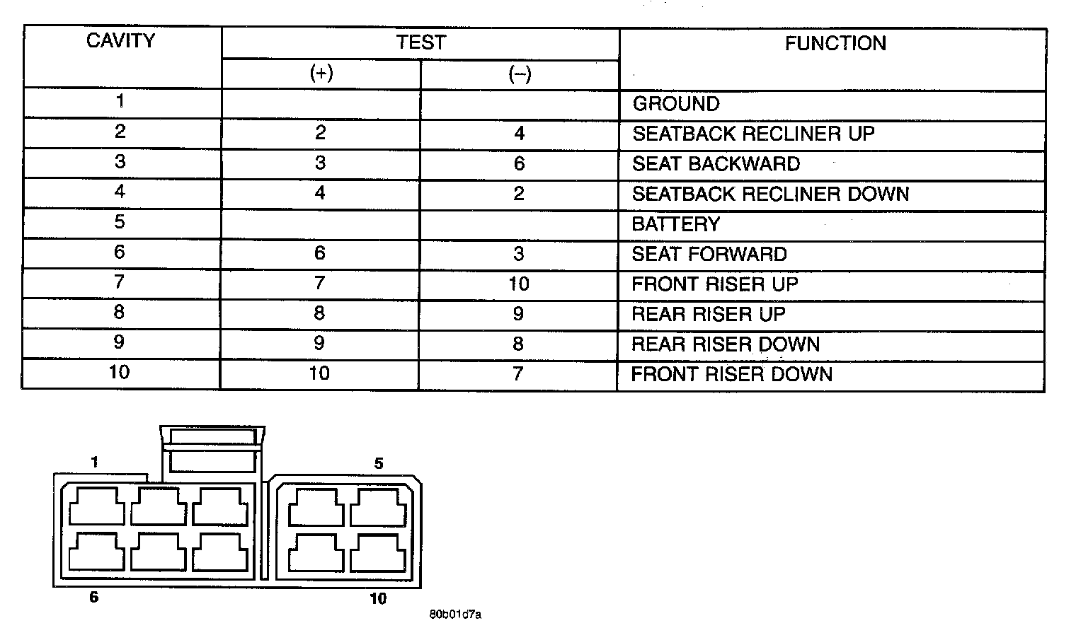 4. To test the seat motors, refer to the above diagram, and verify proper seat responses. Using two jumper wires, connect one to a battery supply and the second to a ground. Connect the other ends to the seat wire harness connector as described in the Switch Harness Connector Circuit Test table.