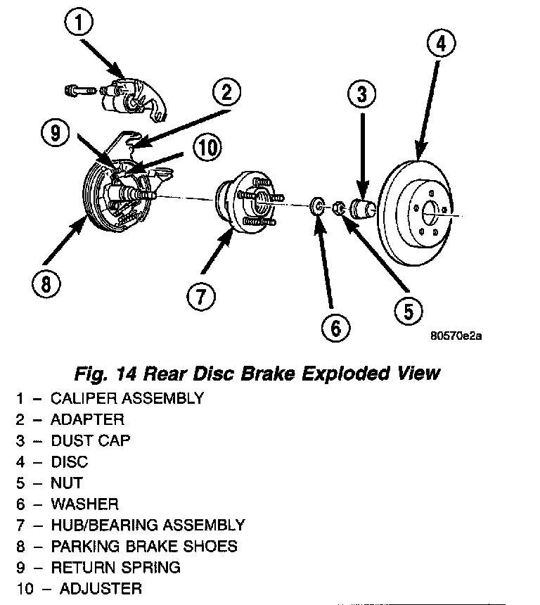 DESCRIPTIONThe rear disc brakes are similar to the front disc brakes, however, there are several distinctive features that require different service procedures. The single piston, floating caliper rear disc brake assembly includes a hub and bearing assembly, adapter, brake rotor, caliper, brake pads/linings.