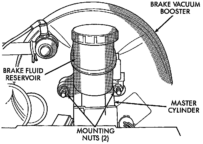 4. Remove the 2 nuts attaching master cylinder assembly to power brake vacuum booster.