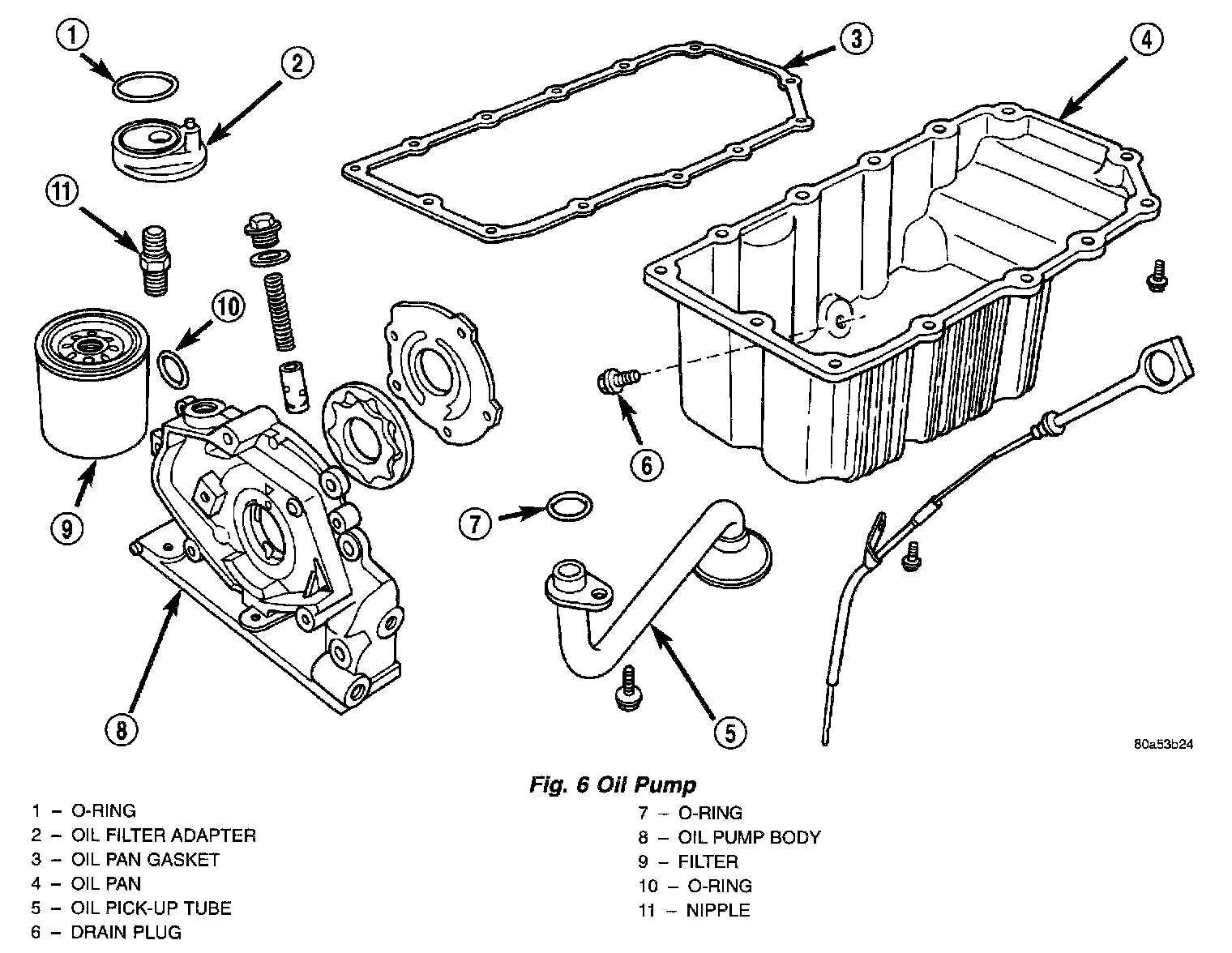 The lubrication system is a full-flow filtration, pressure feed type. The oil pump is mounted in the front engine cover and driven by the crankshaft (Fig. 6).