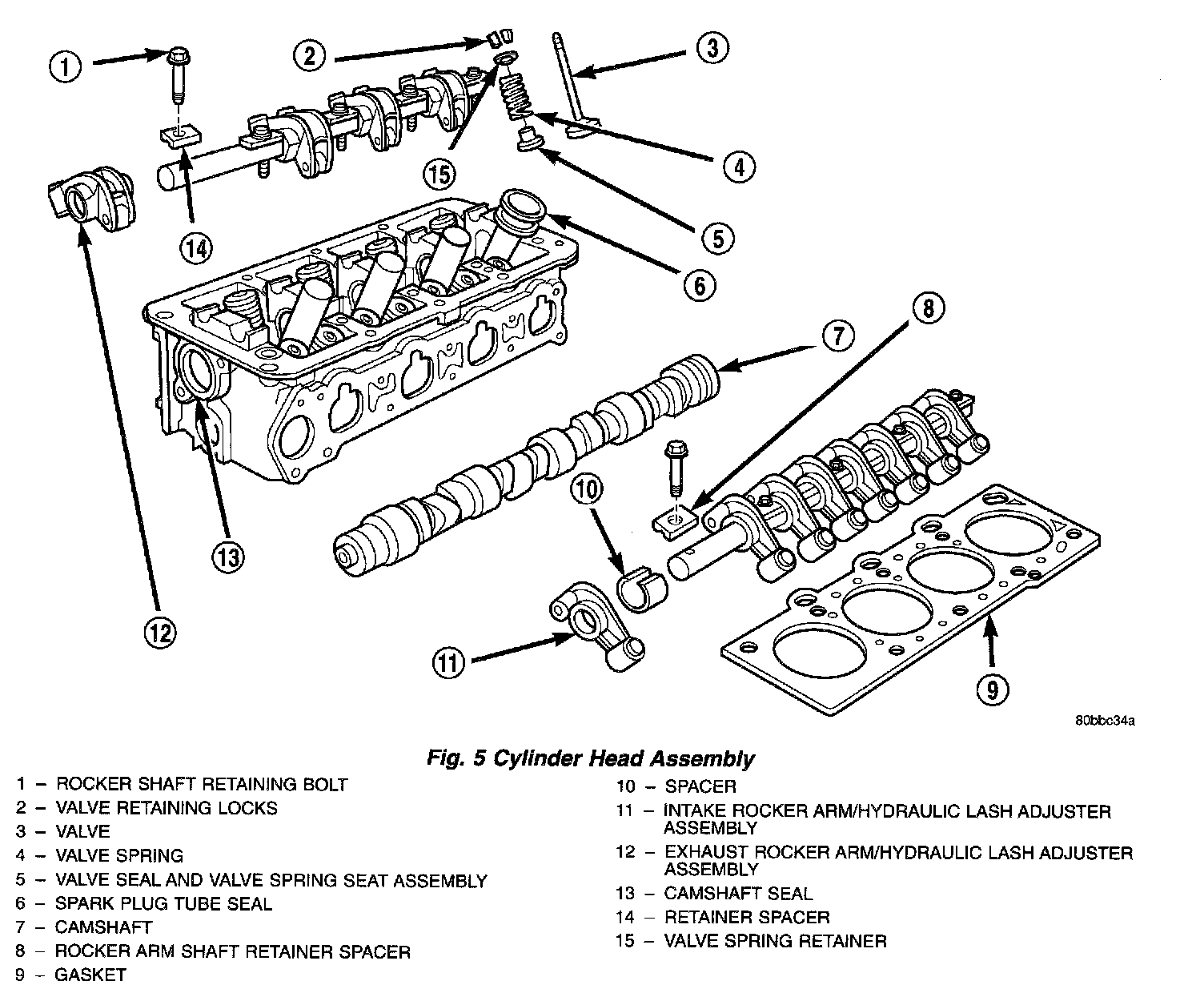 The rocker arm shafts mount directly to the cylinder head. The rocker arms shafts are hollow, providing lubrication passages to the hydraulic lash adjusters, camshaft, and valve mechanisms (Fig. 5).