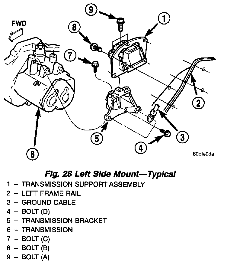 2. Remove the three vertical bolts (A) from the mount to the transmission bracket (Fig. 28).