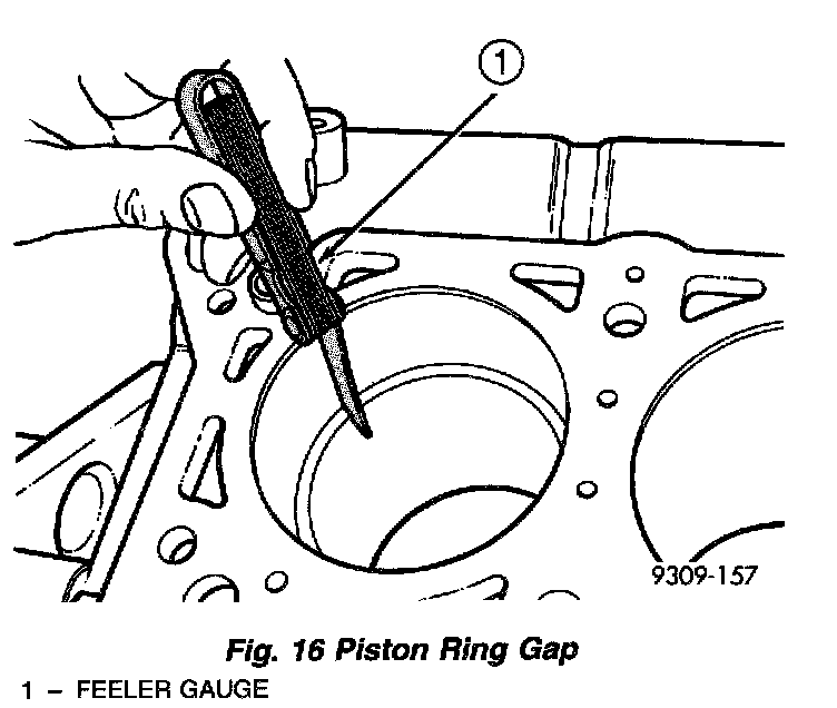 1. Wipe cylinder bore clean. Insert ring and push down with piston to ensure it is square in bore. The ring gap measurement must be made with the ring positioned below normal ring travel in the cylinder bore. Check gap with feeler gauge (Fig. 16). Refer to Engine Specifications for piston ring specifications.