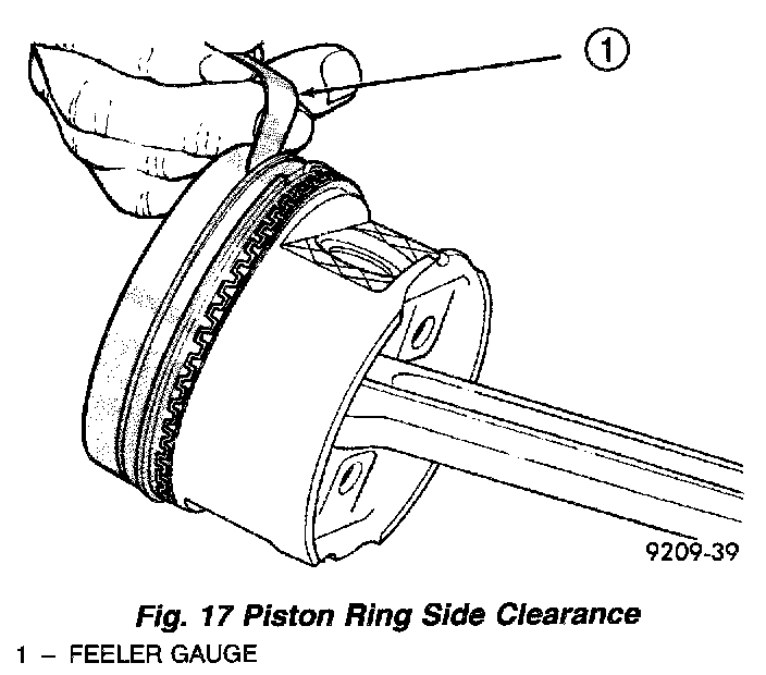 2. Check piston ring to groove side clearance (Fig. 17). Refer to Engine Specifications for piston ring specifications.