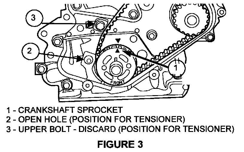 5. To install the hydraulic tensioner, first remove and discard the upper bolt as shown in Figure 3. Install the hydraulic tensioner with the 2 bolts from the kit into the location shown in Figure 3. Do not tighten the 2 bolts at this time.