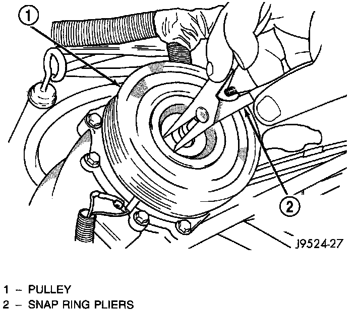 13. Remove the snap ring from the compressor hub and remove the clutch field coil. Slide the clutch field coil off of the compressor hub.
